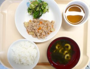 昼食:ごはん、じゃが芋のそぼろ煮、ブロッコリーのじゃこ和え、すまし汁(ちくわ、わかめ、三つ葉)、麦茶