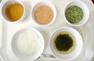 離乳食(後期)午後おやつ:にんじんごはん、麦茶