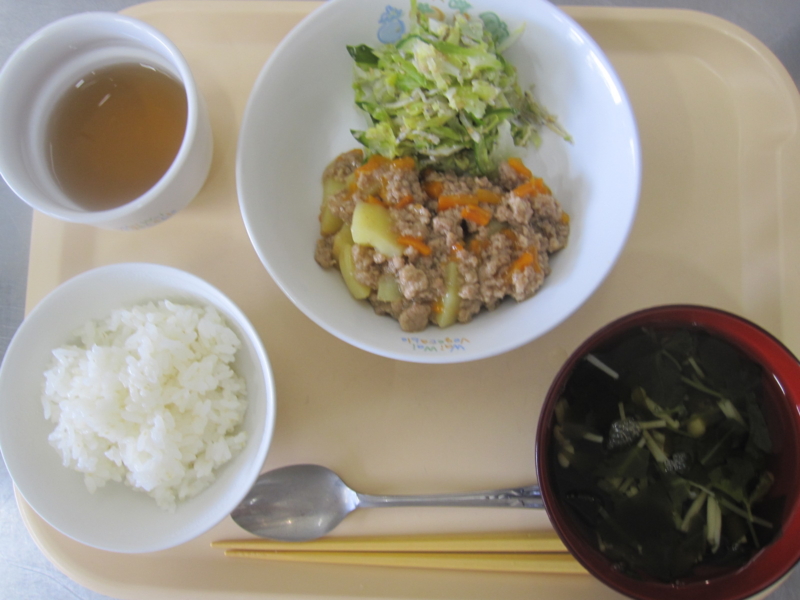 昼食:ご飯、じゃがいものそぼろ煮、じゃこサラダ、すまし汁(わかめ、三つ葉、えのき)、オレンジ(乳児のみ)、麦茶