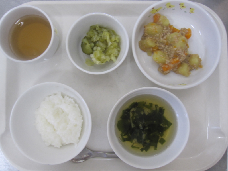 離乳食(後期)昼食:おかゆ、じゃがいものそぼろ煮、おひたし、すまし汁、麦茶