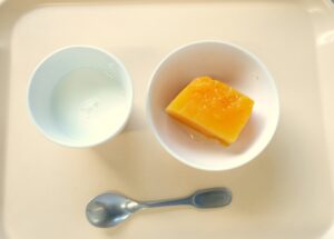 離乳食後期のおやつ:にんじんごはん(またはおかゆ)、麦茶