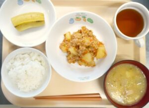 昼食:ごはん、じゃがマーボー、コーンスープ、 バナナ、麦茶