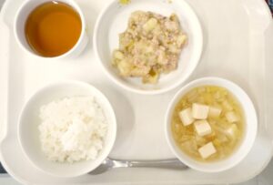 離乳食後期の昼食:おかゆ、または軟飯、じゃがいものそぼろ煮、豆腐と野菜のスープ、麦茶