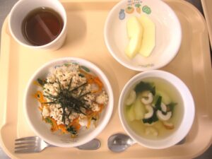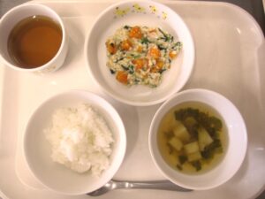昼食:そぼろ丼、ポテトスープ(じゃがいも、にら、ちくわ)、りんご、麦茶