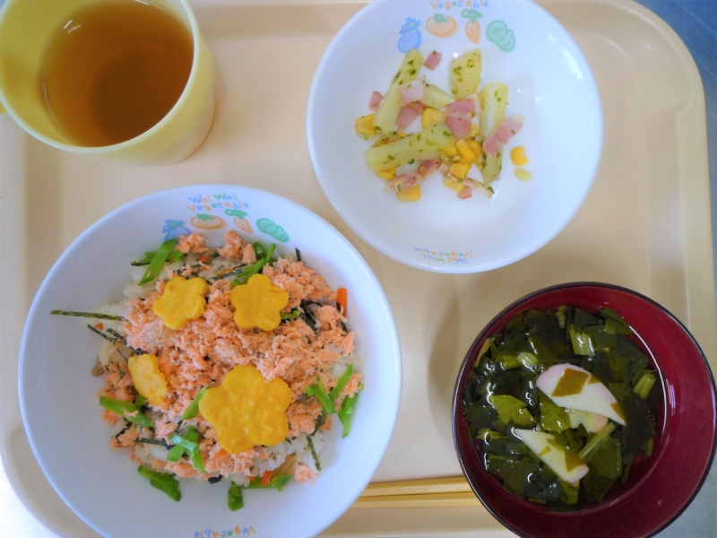 今日はひな祭り給食です。ちらし寿司の黄色いお花は、卵ではなくかぼちゃ・豆腐・鶏ひき肉で作っています。たけのこや人参を混ぜたご飯に子どもたちが大好きな焼き鮭のそぼろをのせました。