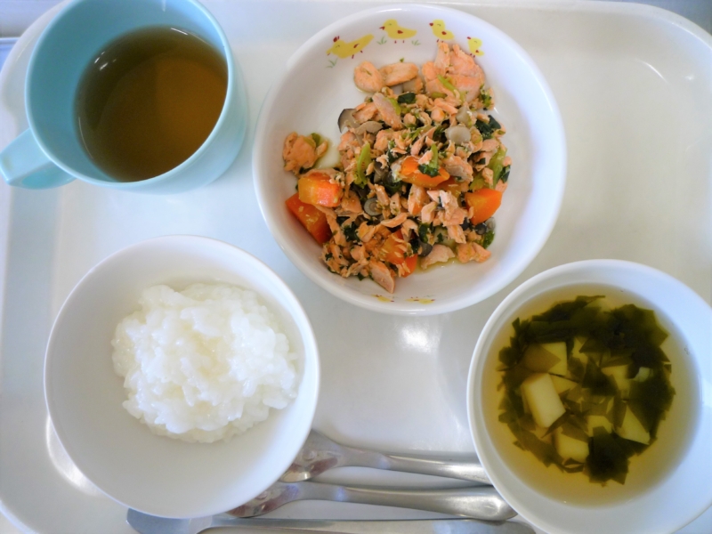 離乳食(後期)昼食:おかゆ、鮭と野菜煮、すまし汁