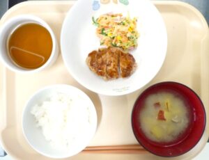 西柴保育園のとんかつは、小間切れ肉に片栗粉を少量混ぜて成型し、米粉と米パン粉で衣をつけ、オーブンで揚げ焼きにします。卵と小麦を使用せずアレルギーの児も同じものを食べます。中は柔らかく、外はさっくりと仕上げています。