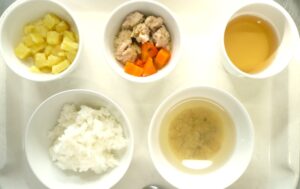 離乳食(後期)昼食:軟飯、豚つくねと野菜煮、さつまいも煮、みそ汁
