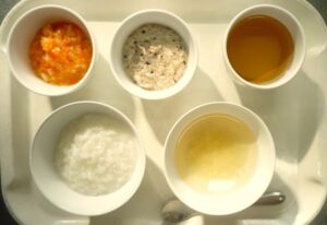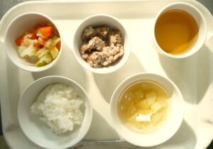 離乳食(中期)午前食:おかゆ、ひじきハンバーグ、おひたし、スープ