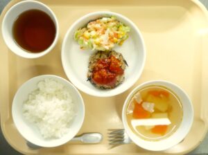 昼食:ごはん、ひじきハンバーグ、コールスローサラダ、スープ