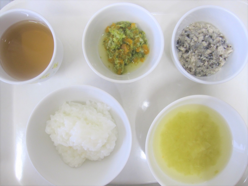 離乳食(中期)午前食:おかゆ、ひじき入り肉団子、おひたし、スープ