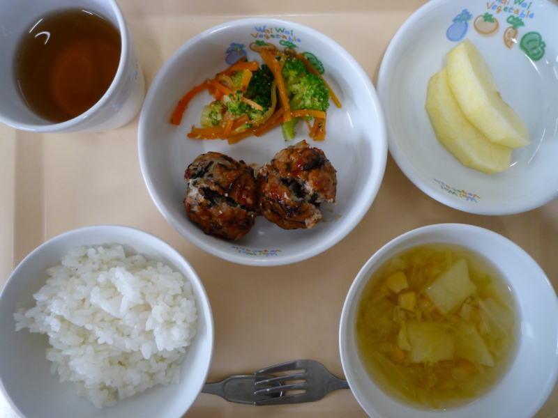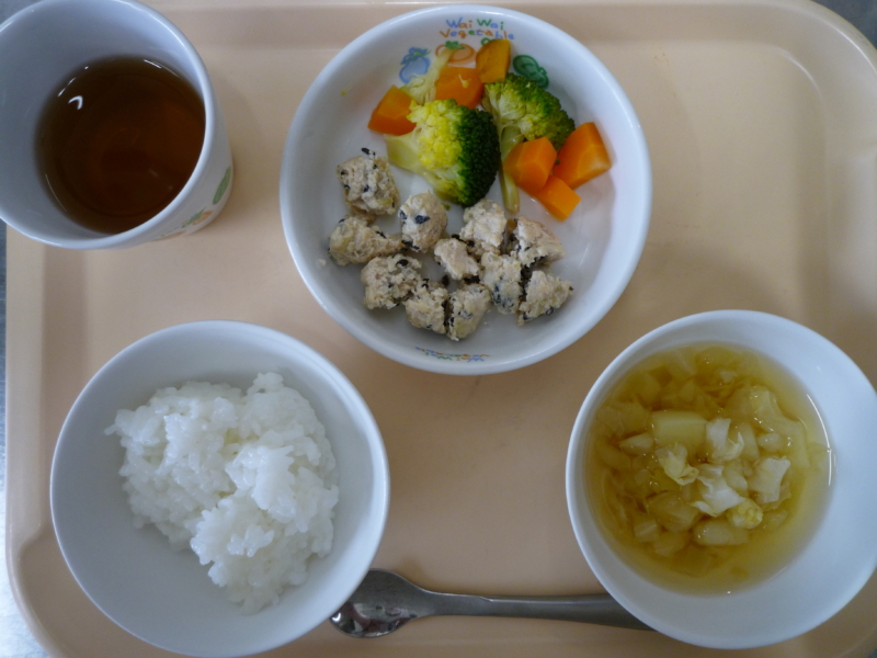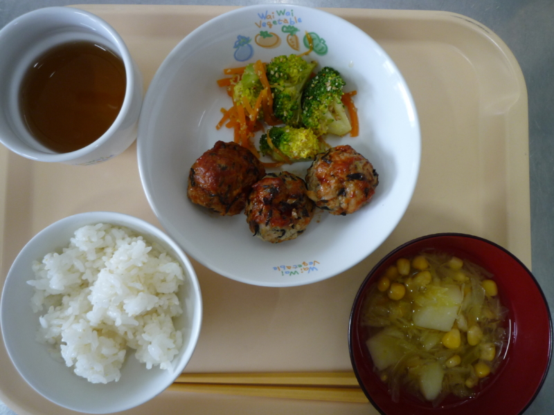 昼食:ご飯、ひじきミートボール、ブロッコリーのごまサラダ、スープ(キャベツ、じゃがいも、コーン)、麦茶