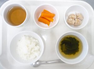離乳食中期の昼食:軟飯、鶏そぼろ煮、スティック人参、スープ(チンゲン菜、わかめ)