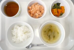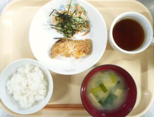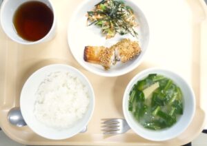 昼食:ごはん、ぶりの塩こうじ焼き、切干大根のマヨ和え、みそ汁(高野豆腐、にら、たまねぎ)、麦茶