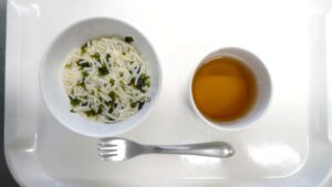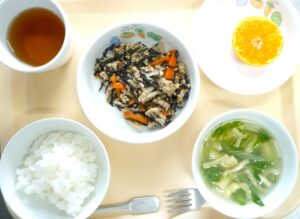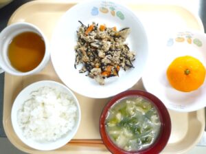 昼食:ごはん、れんこんのそぼろ炒め、みそ汁、みかん、麦茶