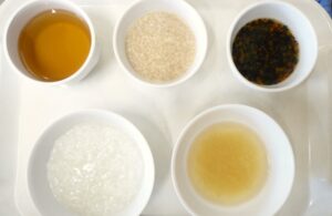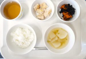 離乳食(中期)午前食:おかゆ、つくね煮、ひじき煮、すまし汁