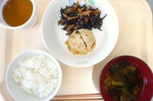 昼食:ごはん、れんこんのつくね焼き、ひじきの炒り煮、すまし汁