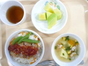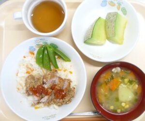 昼食:エスカロップ、スナップえんどう、メロン、どさんこ汁、麦茶