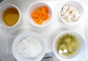 離乳食(中期)の昼食:おかゆ、つくね団子煮、スティック人参、すまし汁、麦茶