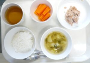 離乳食(後期)昼食:軟飯またはおかゆ、ハンバーグ、人参スティック、すまし汁