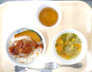 今日は北海道郷土料理。デミグラスソース仕立てにしたケチャップソースをとんかつに添えて、刻んだたけのこが入ったご飯がアクセントのエスカロップ。北海道産の人参、じゃがいも、玉ねぎを使ったどさんこ汁を提供しました。