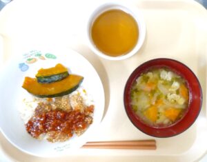 離乳食(後期)昼食:軟飯またはおかゆ、豚つくね煮、焼きかぼちゃ、みそ汁、麦茶