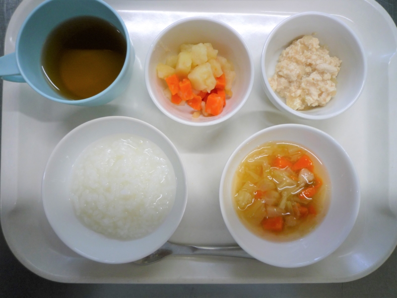 離乳食(中期)午前食:おかゆ、ささみのとろ煮、じゃが芋煮、すまし汁