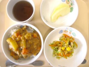 昼食:ごはん、カレー、キャベツの和風サラダ、りんご(乳児のみ)、麦茶