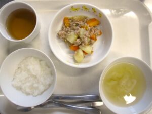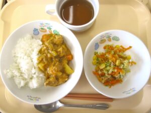 西柴保育園のカレーは上新粉とサラダ油、ケチャップ、ウスターソース、カレーパウダーを使って、ルーを作っています。野菜もたっぷり入れて、子どもたちもニコニコで食べていました。
