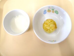 離乳食(中期)午前食:おかゆ、じゃがいもと野菜のそぼろ煮、スープ