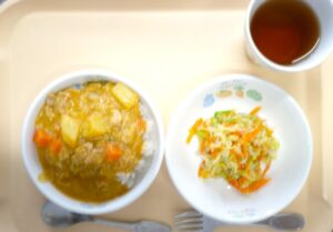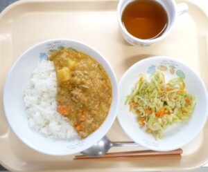 昼食:ごはん、カレー、キャベツとじゃこのサラダ、麦茶