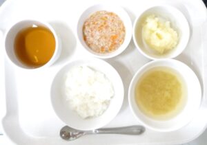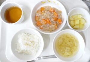 離乳食後期の昼食:軟飯またはおかゆ、野菜のそぼろ煮、ベイクドポテトまたはじゃがいも煮、みそ汁(キャベツ)、麦茶