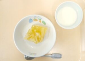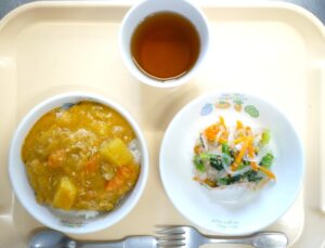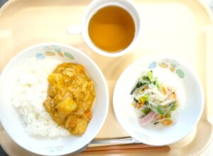 今年度はじまり、初めてのカレー。具材は玉ねぎ、人参、じゃがいも、豚肉。上新粉で作った手作りルーと豆乳を入れ、やさしいカレーに仕上げました。