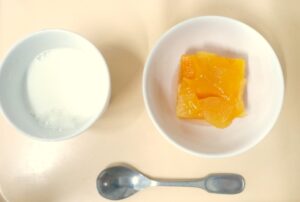 午後おやつ:りんごとオレンジのゼリー、牛乳