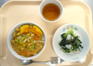離乳食(後期)昼食:おかゆまたは軟飯、キャベツのそぼろ煮、焼きかぼちゃ(またはかぼちゃ煮)、かぶのスープ