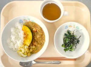 昼食:ごはん、キャベツカレー、しらすサラダ