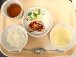 昼食:ごはん、ミートローフ、ブロッコリーとツナのサラダ、コーンスープ