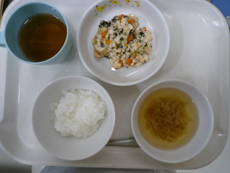 離乳食後期、昼食:全粥、ささみと野菜のごま煮、すまし汁、麦茶