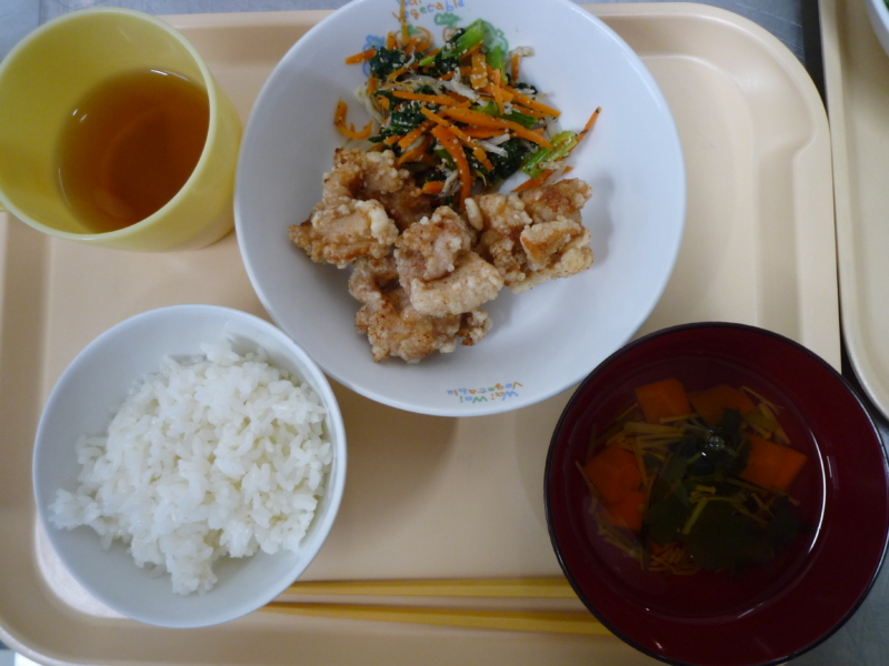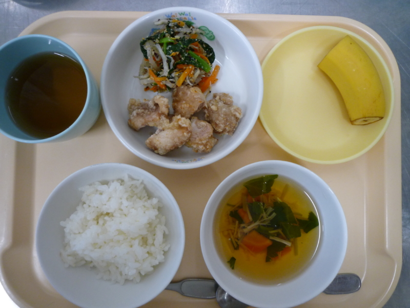 昼食:ご飯、スタミナから揚げ、ゆかりあえ、すまし汁、バナナ(乳児のみ)、麦茶…乳児298㎉幼児342㎉