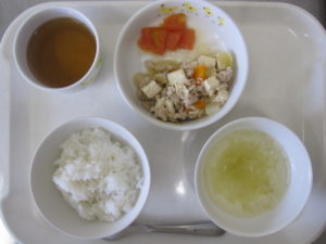 離乳食(中期)午前食:おかゆ、肉豆腐、トマト、スープ、麦茶
