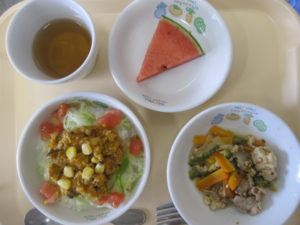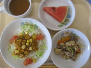 昼食:タコライス、ゴーヤチャンプルー、すいか、麦茶
