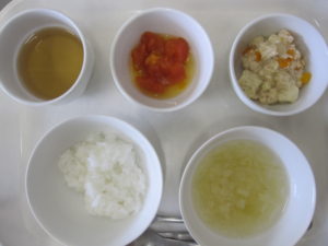 離乳食(中期)午前食:おかゆ、肉豆腐、トマト、スープ、麦茶