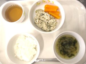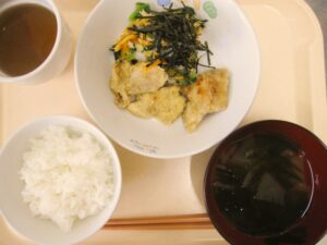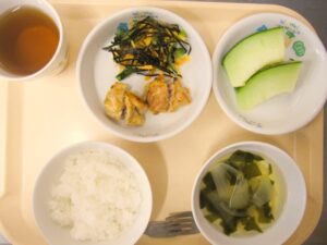 昼食:ごはん、タンドリーチキン、ツナサラダ、スープ(わかめ、冬瓜、たまねぎ)、メロン(乳児のみ)、麦茶