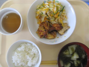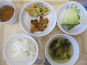 昼食:ご飯、タンドリーチキン、ツナサラダ、スープ(じゃがいも、わかめ、玉ねぎ)、バナナ(乳児のみ)、麦茶