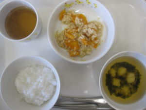 離乳食(後期)昼食:おかゆ、鶏ひき肉と野菜の煮物、ポテトスープ