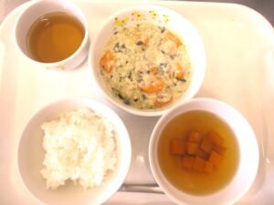 離乳食(後期)昼食:お粥又は軟飯、チキンクリーム煮、スープ