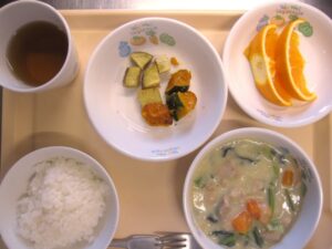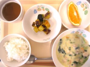 昼食:ご飯、チキンクリーム煮、おさつサラダ、オレンジ、麦茶