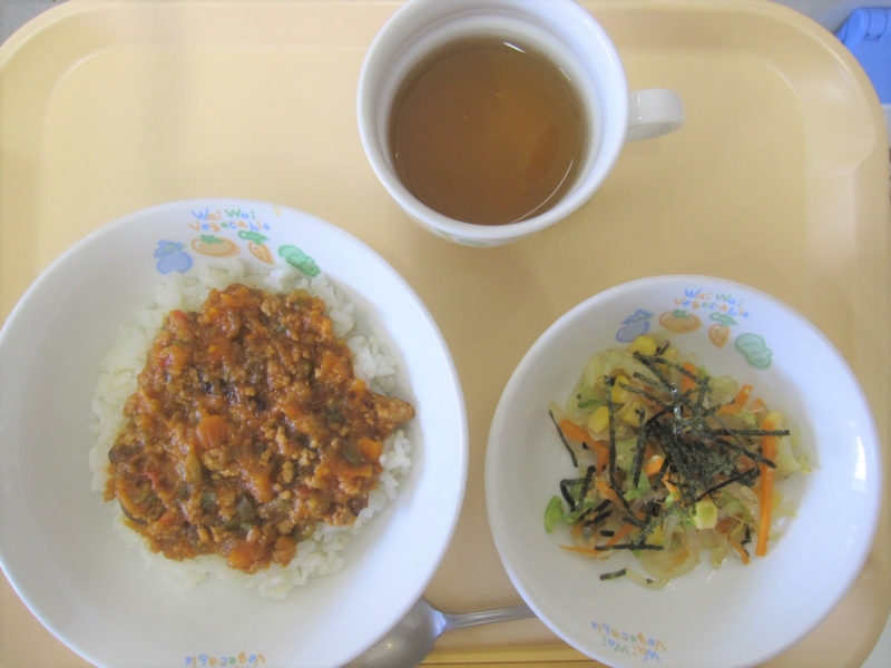 昼食:ドライカレー、ごはん、春雨サラダ、りんご(乳児のみ)、麦茶