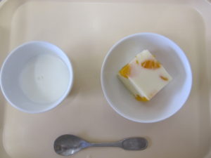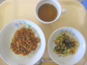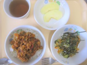 昼食:ドライカレー、和風春雨サラダ(春雨、キャベツ、人参、コーン、のり、ごま)、りんご(乳児のみ)