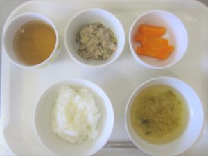 離乳食(後期)昼食:おかゆ、なすのそぼろ煮、スティック野菜、スープ